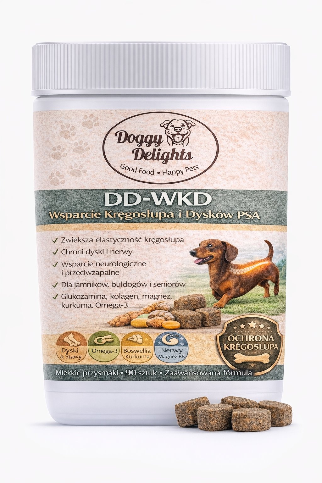 DD-WKD to zaawansowany suplement diety dla psów, stworzony z myślą o ochronie kręgosłupa, dysków międzykręgowych oraz układu nerwowego. Formuła została opracowana szczególnie dla ras predysponowanych do problemów z kręgosłupem (np. jamniki, buldogi, corgi), psów aktywnych oraz seniorów.